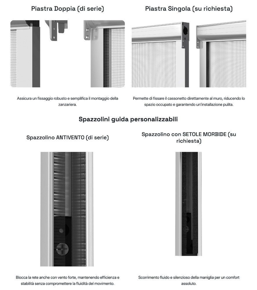 The BIKITVER PRIMED vertical mosquito net comes standard with a double plate , which ensures a sturdy attachment and makes assembly quick, even for inexperienced users. If you prefer a more minimalist installation, you can choose the optional single plate , which allows the box to be attached directly to the wall and further reduces the overall size. Alternatively, the package also includes box clips (standard), useful when you don't want to use the plates.