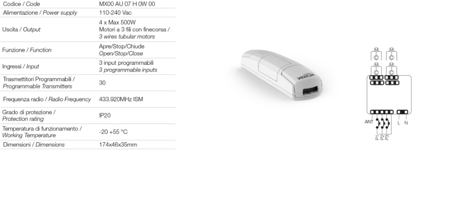 can control up to 4 230 Vac actuators, each with a maximum power of 500 W, and is compatible with 3-wire motors with limit switches. The 3 programmable wired inputs can be set for step-by-step control, deadman control, or for managing weather sensors. The opening, stop, and closing functions are fully configurable, making the system suitable for both residential and professional environments.