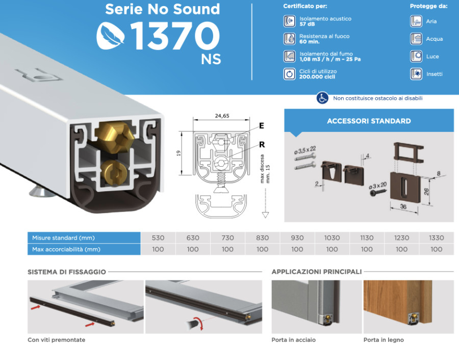 certified sound insulation up to 57 dB and complete protection against air, water, light and insects. Thanks to the double adjustment mechanism (DR), it guarantees uniform pressure along the entire length, ensuring a hermetic seal.