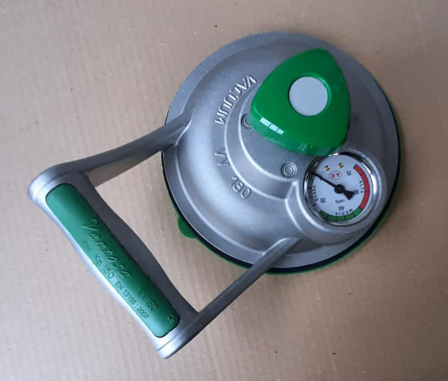 This suction cup for glass is equipped with a central knob for vacuum regulation and a low-medium-high vacuum indicator vacuum gauge.