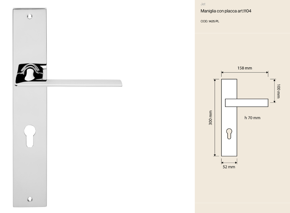 The Jet Linea Calì handle with plate represents the essence of modern design: thin lines, perfectly smooth surfaces and an essential geometry that gives elegance to every door.