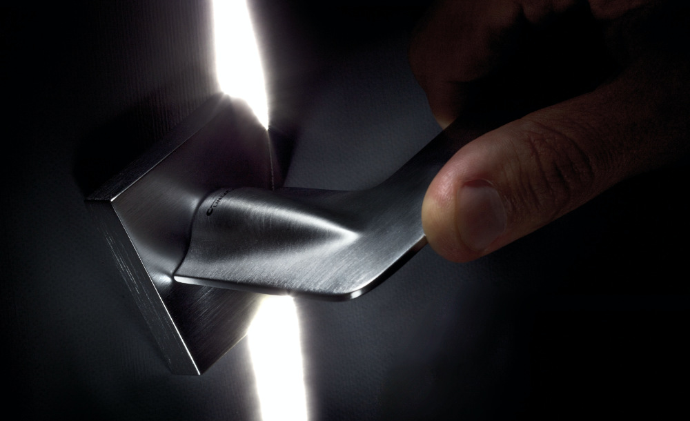 Its slim, precise handle offers a surprising amount of comfort and security, thanks to perfectly rounded edges. The sharp, lightweight front profile contrasts with the more assertive upper profile, which reflects the light and gives the whole a refined sense of lightness.