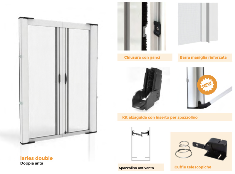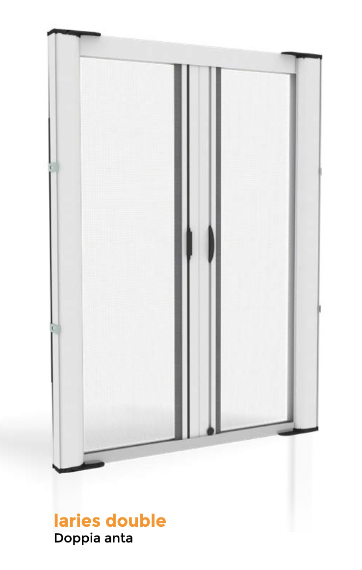 The Laries Double side insect screen is an excellent solution for openings with two doors . The standard model has a footprint of 42 mm , but a reduced footprint version of 32 mm can be obtained on request, ideal for spaces with limited space.