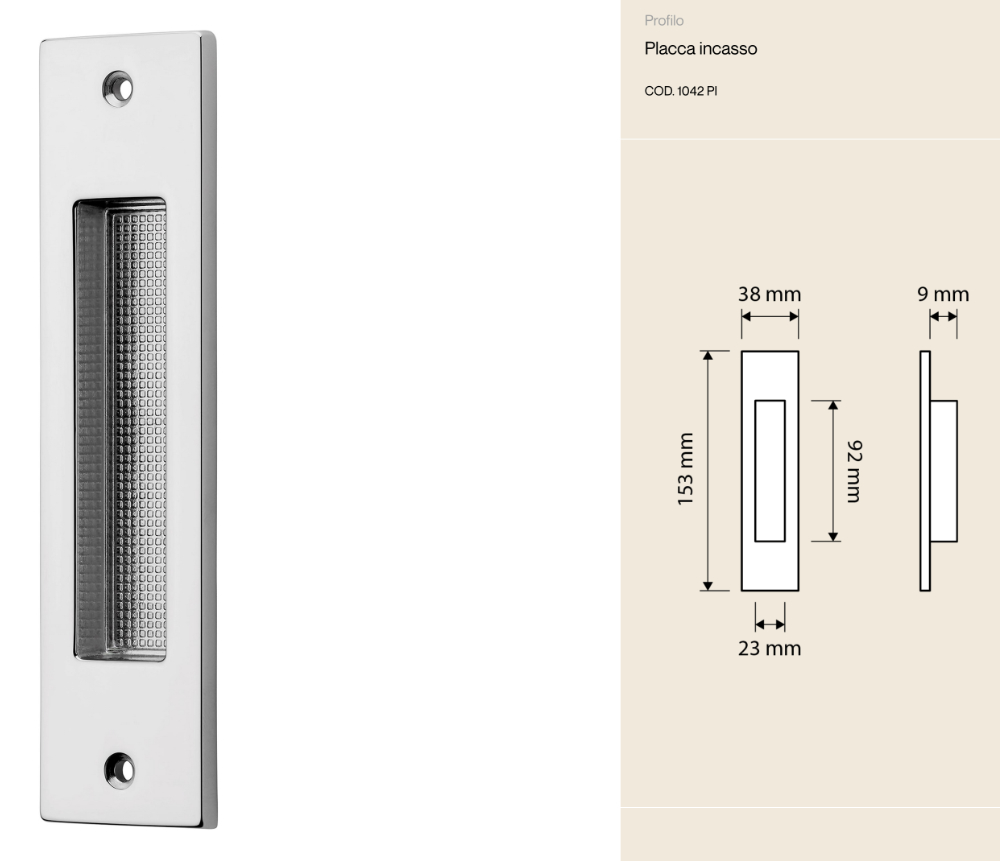 The Profilo Linea Calì recessed plate is designed for modern sliding doors that require a refined and unobtrusive solution. Its slim profile and meticulously crafted surface make this accessory not only practical but also a stylish detail that enhances any space.