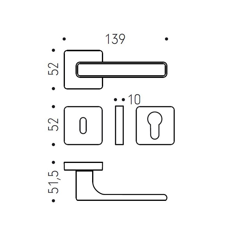 Dimensions: length 139 mm – rosette 52x52 mm – thickness 10 mm.
