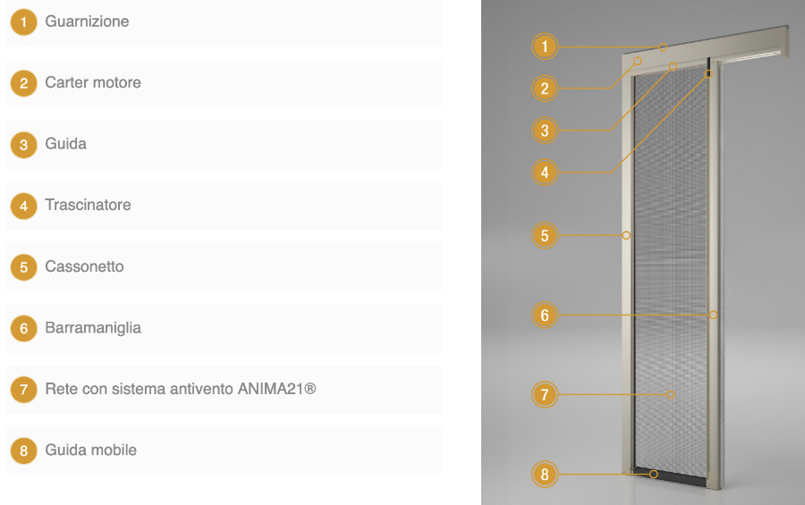 It integrates the innovative ANIMA21 Bettio windproof system net, which allows the net to automatically retract in the event of strong wind or impacts. Profiles and plastics are designed for anti-bedbug mosquito nets, capable of creating an effective barrier against bedbugs.