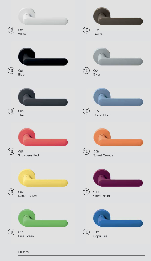 The Colombo Design Mood collection offers handles and accessories available in a wide variety of colored finishes, designed to suit different styles and environments. The vast color palette allows for customization of every detail, transforming the door handle into a decorative element.