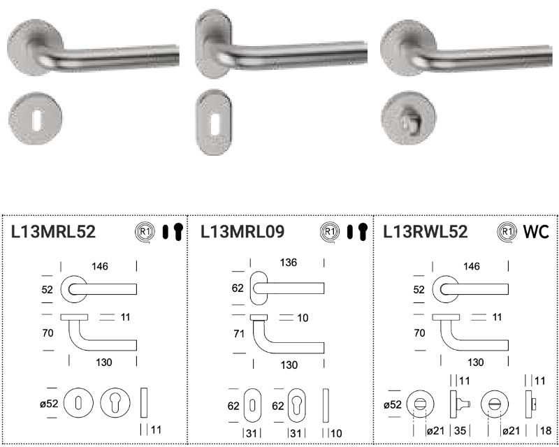 - Handle with Ø52x10 mm rose and with patent or yale drilling nozzles;