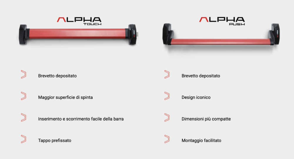 Panic exit device CISA ALPHA: a reliable, certified solution ensuring a safe and immediate exit in case of emergency, available in TOUCH and PUSH versions to suit any door.