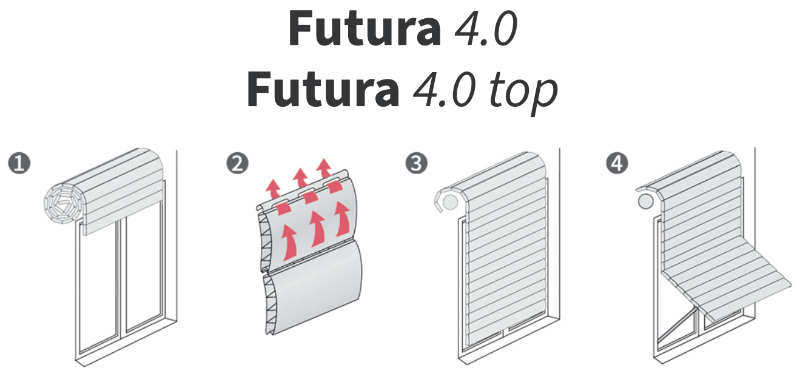 The FUTURA 4.0 TOP roller shutter is the evolution of the traditional Pasini solution for PVC shading systems. FUTURA 4.0 TOP PVC roller shutters guarantee excellent performance, rigidity and strength .