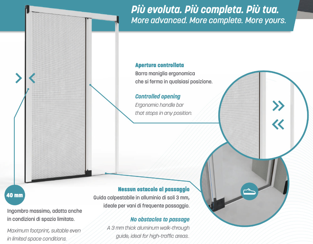 The brushed track ensures better stability of the net even in windy conditions, while the closed upper guide offers effective protection against the entry of insects, even the smallest and most annoying ones.