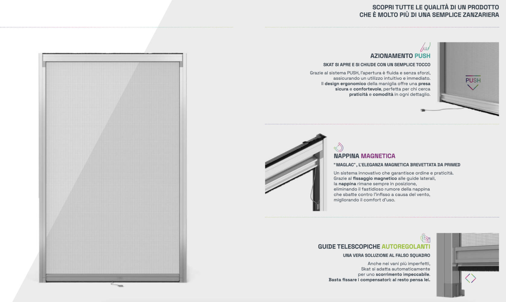 The SKAT mosquito net by PRIMED is designed for those who want to combine practicality and aesthetics: a product with a refined design, yet packed with technical solutions that truly make a difference in everyday use. Thanks to its intelligent features and the option to customize it, SKAT is the ideal choice for those who want to protect their home from insects with a reliable, convenient solution that integrates well with any window style.