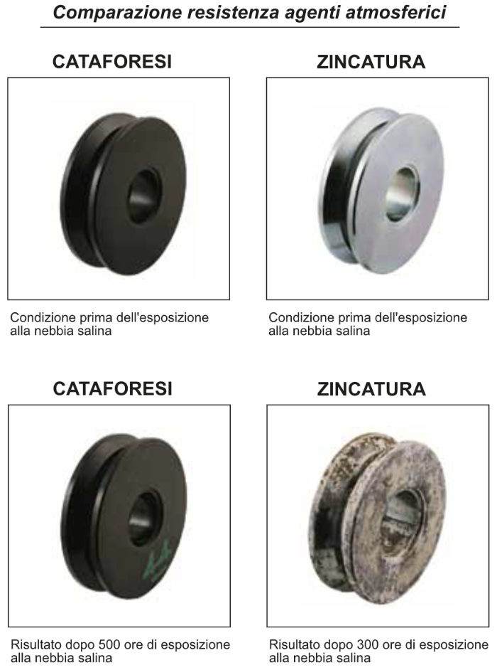 Cataphoresis guarantees greater protection against corrosion of gate wheels over time than galvanizing. Each production batch is subjected to accelerated salt spray corrosion tests, internationally recognized, capable of simulating the real life of a component and proving its resistance to corrosion.