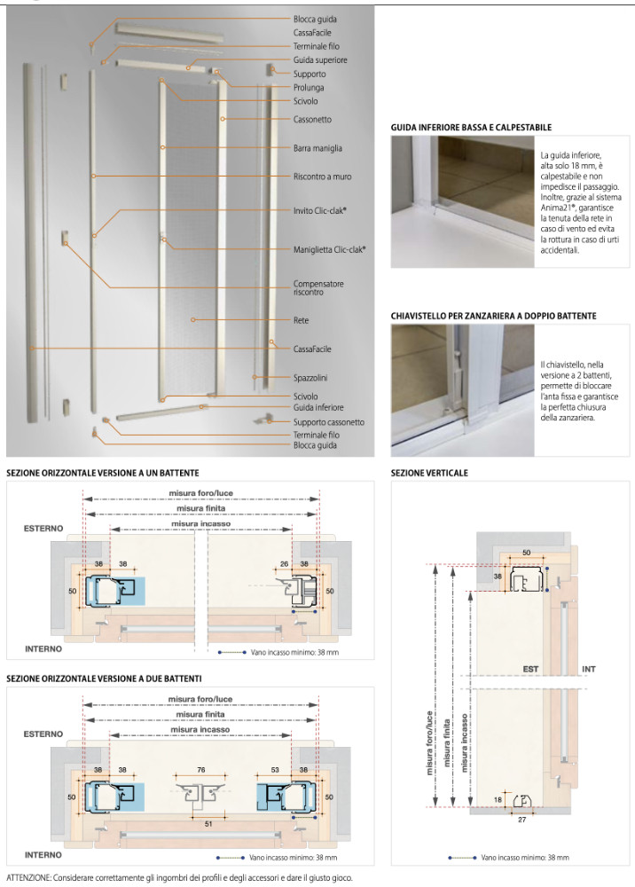 Virtus Incasso stands out for its modern lines, small footprint, a walkable floor guide, the Clic-Clak® system for intuitive opening and the possibility of partially opening the mosquito net. These features reflect Bettio's commitment to offering you a superior quality product.