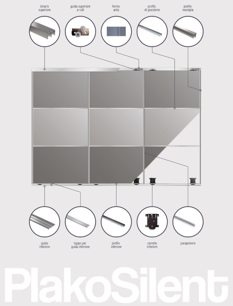 PlaKoSilent is a sliding system for doors, wardrobes, niches and movable walls, easy to create and quick to apply. The components are in kits, protected by protective film and packaged in cardboard tubes. The system was developed for the professional world but due to its simplicity it could also be installed by inexperienced users.